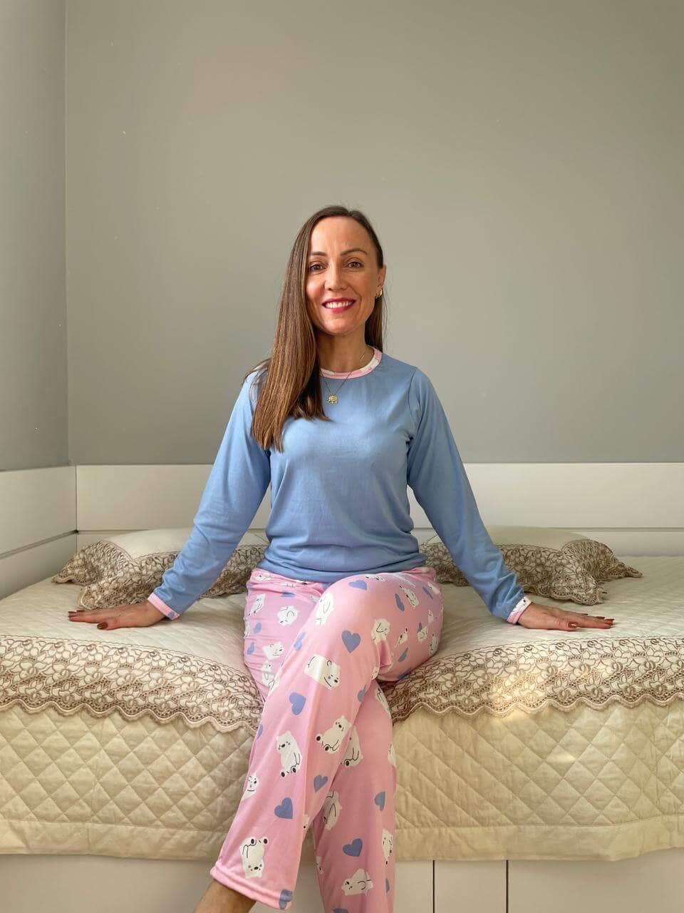Este pijama é um verdadeiro mimo de peça: confeccionado em tecido suede com 90% Poliéster e 10% de Elastano, proporcionando um toque macio e aveludado como uma pele de pêssego, além de uma sensação super leve em contato com a pele.