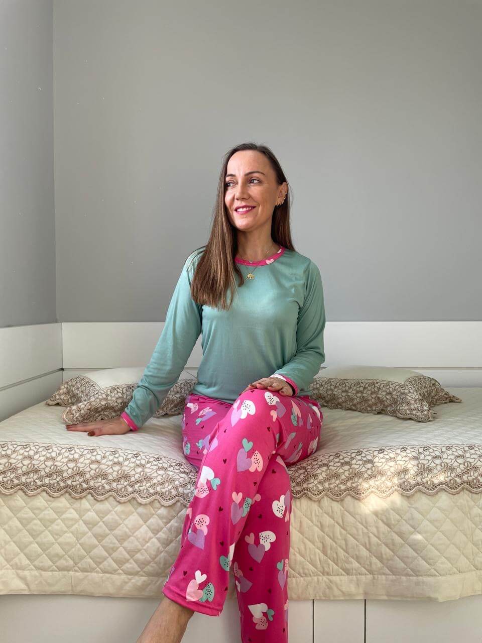 É composto por duas peças: uma camisa de manga longa de acabamento simples e gola redonda, Já a calça longa tem estamparia em toda sua extensão, bem como cós elástico e caimento soltinho.